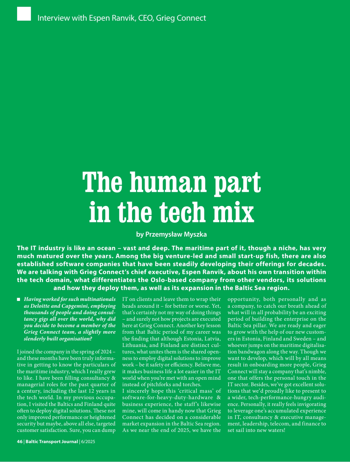We are talking with Grieg Connect's chief executive, Espen Ranvik, about his own transition within the tech domain, what differentiates the Oslo-based company from other vendors, its solutions and how they deploy them, as well as its expansion in the Baltic Sea region.