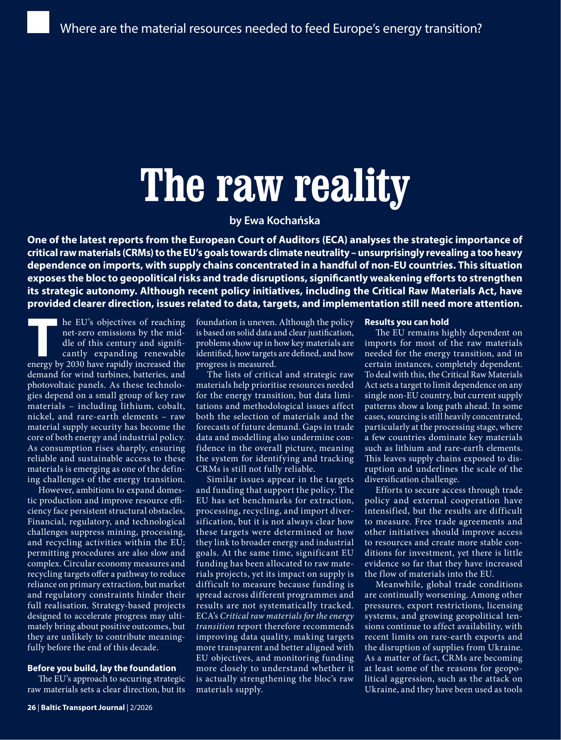 One of the latest reports from the European Court of Auditors (ECA) analyses the strategic importance of critical raw materials (CRMs) to the EU's goals towards climate neutrality - unsurprisingly revealing a too heavy dependence on imports, with supply chains concentrated in a handful of non-EU countries.